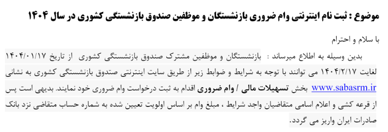 ثبت نام اینترنتی وام ضروری بازنشستگان و موظفین صندوق بازنشستگی کشوری ۲۰ فروردین ۱۴۰۴ | ۱۱:۵۹ کد : ۵۰۶۴۱ اطلاعیه ارسال به دیگران نام شما ایمیل شما ایمیل دریافتکننده ارسال انصراف تعداد بازدید:۴۲۴۳ ثبت نام اینترنتی وام ضروری بازنشستگان و موظفین صندوق بازنشستگی کشوری