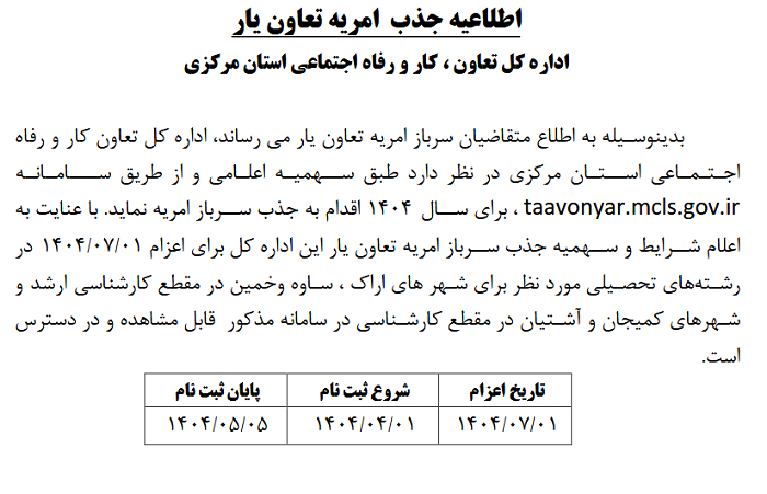 اطلاعیه جذب امریه تعاون یار ۱۱ تیر ۱۴۰۴ | ۱۲:۰۴ کد : ۵۲۷۴۸ اطلاعیه ارسال به دیگران نام شما ایمیل شما ایمیل دریافتکننده ارسال انصراف تعداد بازدید:۱۱۵۷ اطلاعیه جذب امریه تعاون یار
