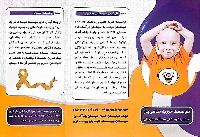 موسسه خیریه " حامی یار " فعال در حوزه سلامت کودکان و حامی کودکان مبتلا به سرطان با یک دهه فعالیت به عنوان اولین و تنها تشکل ملی استان مرکزی، دارای پروانه فعالیت از وزارت کشور می باشد.