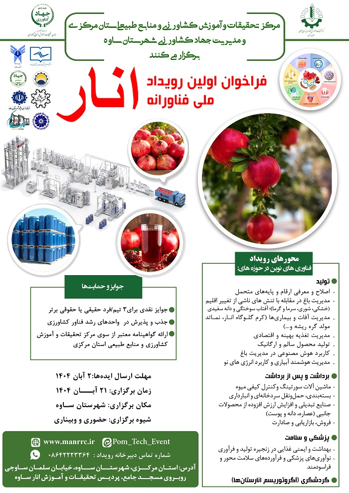 مرکز تحقیقات و آموزش کشاورزی و منابع طبیعی استان مرکزی و مدیریت جهاد کشاورزی ساوه،  اولین رویداد ملی فناورانه انار را برگزار می نمایند.