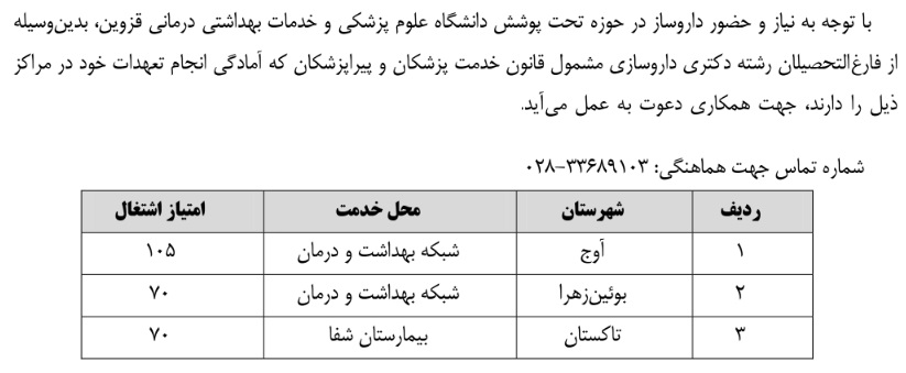 جذب نیروی داروساز مشمول قانون خدمت ۲۵ آذر ۱۴۰۴ | ۰۹:۰۰ کد : ۵۷۰۵۷ اطلاعیه ارسال به دیگران نام شما ایمیل شما ایمیل دریافتکننده ارسال انصراف تعداد بازدید:۶۹۱ جذب نیروی داروساز مشمول قانون خدمت در دانشگاه علوم پزشکی قزوین
