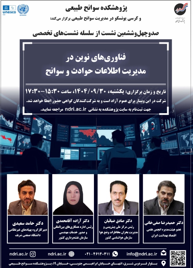 نشست فن آوری نوین در مدیریت اطلاعات حوادث وسوانح ۳۰ آذر ۱۴۰۴ | ۱۲:۰۴ کد : ۵۷۱۴۹ اطلاعیه ارسال به دیگران نام شما ایمیل شما ایمیل دریافتکننده ارسال انصراف تعداد بازدید:۳۱۹ دعوتنامه نشست فن آوری نوین در مدیریت اطلاعات حوادث وسوانح