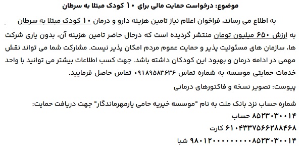 درخواست حمایت مالی، برای ۱۰ کودک مبتلا به سرطان ۰۷ بهمن ۱۴۰۴ | ۱۱:۳۳ کد : ۵۷۷۳۲ اطلاعیه ارسال به دیگران نام شما ایمیل شما ایمیل دریافتکننده ارسال انصراف تعداد بازدید:۳۴۱ موسسه خیریه حامی یار، درخواست حمایت مالی، برای ۱۰ کودک مبتلا به سرطان را دارد.